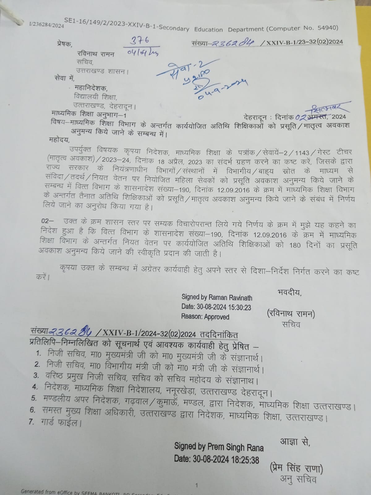 देहरादून। उत्तराखंड के माध्यमिक स्कूलों में तैनात अतिथि शिक्षिकाओं को भी 180 दिन का प्रसूति और मातृत्व अवकाश मिलेगा। शिक्षा सचिव रविनाथ रमन ने इसके आदेश कर दिए हैं। उत्तराखंड माध्यमिक अतिथि संघ ने 180 दिन का मातृत्व अवकाश स्वीकृत करने पर राज्य सरकार का आभार व्यक्त किया है।