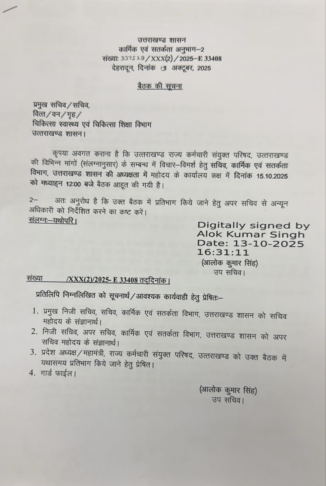 देहरादून। राज्य कर्मचारियों के विभिन्न लंबित प्रकरणों का लेकर सचिव (कार्मिक) शैलेश बगौली की अध्यक्षता में 15 अक्टूबर 2025 को सचिवालय में विभिन्न विभागों के प्रमुखों की राज्य कर्मचारी संयुक्त परिषद के पदाधिकारियों के साथ में महत्वपूर्ण बैठक बुलाई गई है।