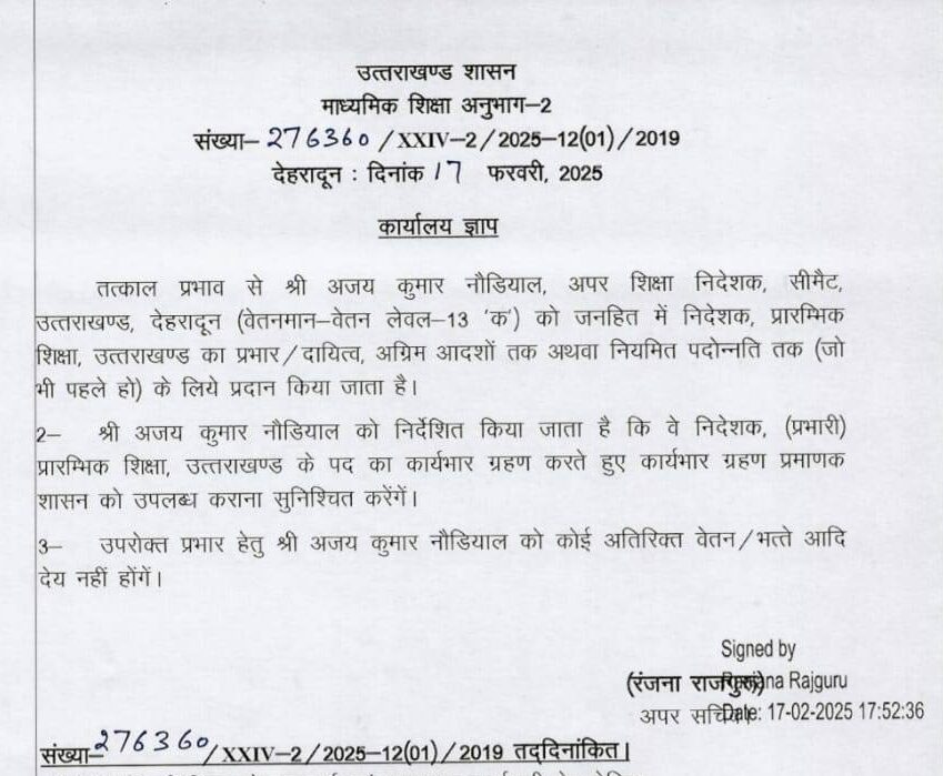 इसके अलावा अपर शिक्षा निदेशक सीमैट अजय कुमार नौडियाल को अग्रिम आदेशों अथवा नियमिति पदोन्नति तक जो भी पहले हो निदेशक प्रारभिंक शिक्षा का प्रभार सौंपा गया है।