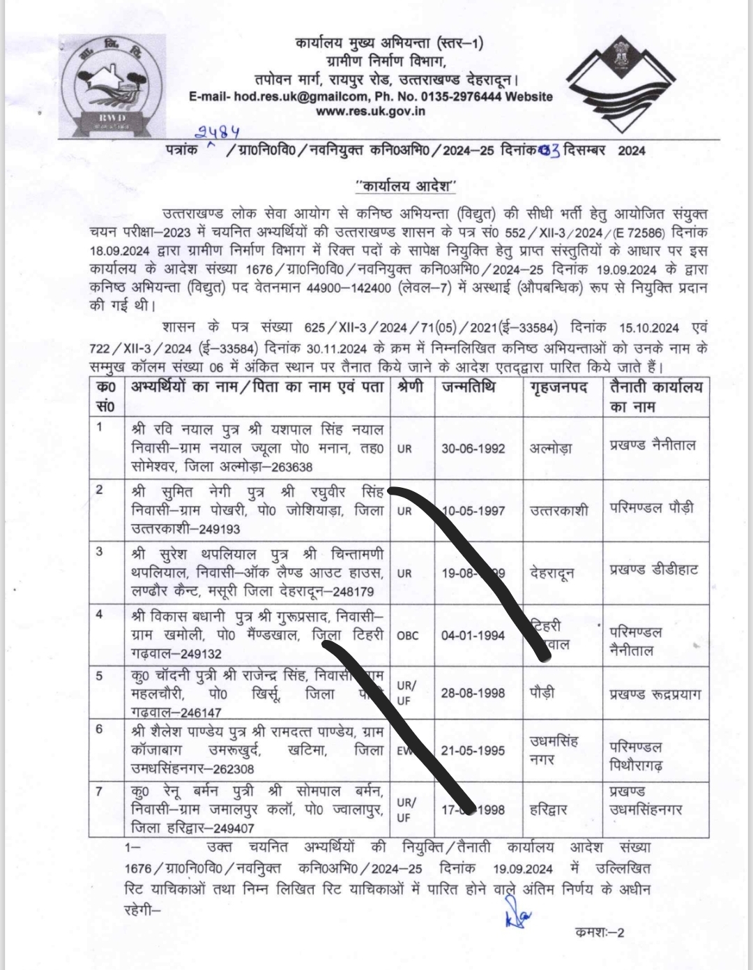 देहरादून।उत्तराखण्ड लोक सेवा आयोग से कनिष्ठ अभियन्ता (विद्युत) की सीधी भर्ती हेतु आयोजित संयुक्त चयन परीक्षा-2023 में चयनित अभ्यर्थियों की उत्तराखण्ड शासन के पत्र सं० 552/XII-3/2024/(E 72586) दिनांक 18.09.2024 द्वारा ग्रामीण निर्माण विभाग में रिक्त पदों के सापेक्ष नियुक्ति हेतु प्राप्त संस्तुतियों के आधार पर इस कार्यालय के आदेश संख्या 1676/ ग्रा०नि०वि०/ नवनियुक्त कनि०अभि०/2024-25 दिनांक 19.09.2024 के द्वारा कनिष्ठ अभियन्ता (विद्युत) पद वेतनमान 44900-142400 (लेवल-7) में अस्थाई (औपबन्धिक) रूप से नियुक्ति प्रदान की गई थी।