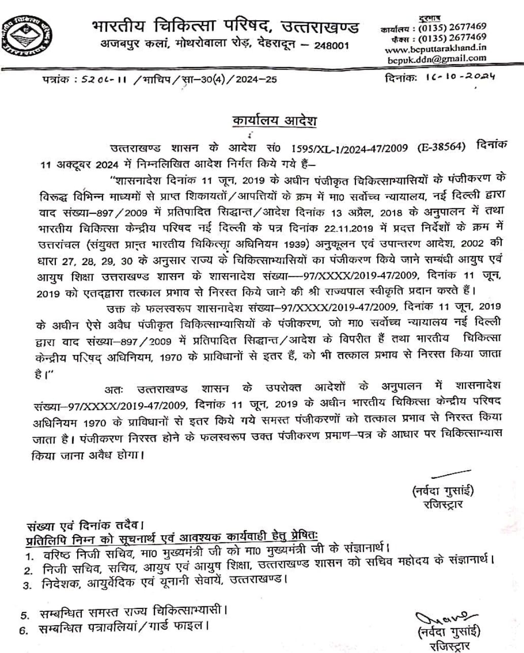 आदेश में कहा गया है कि उक्त पंजीकरण प्रमाण-पत्र के आधार पर चिकित्साभ्यास किया जाना अवैध होगा।