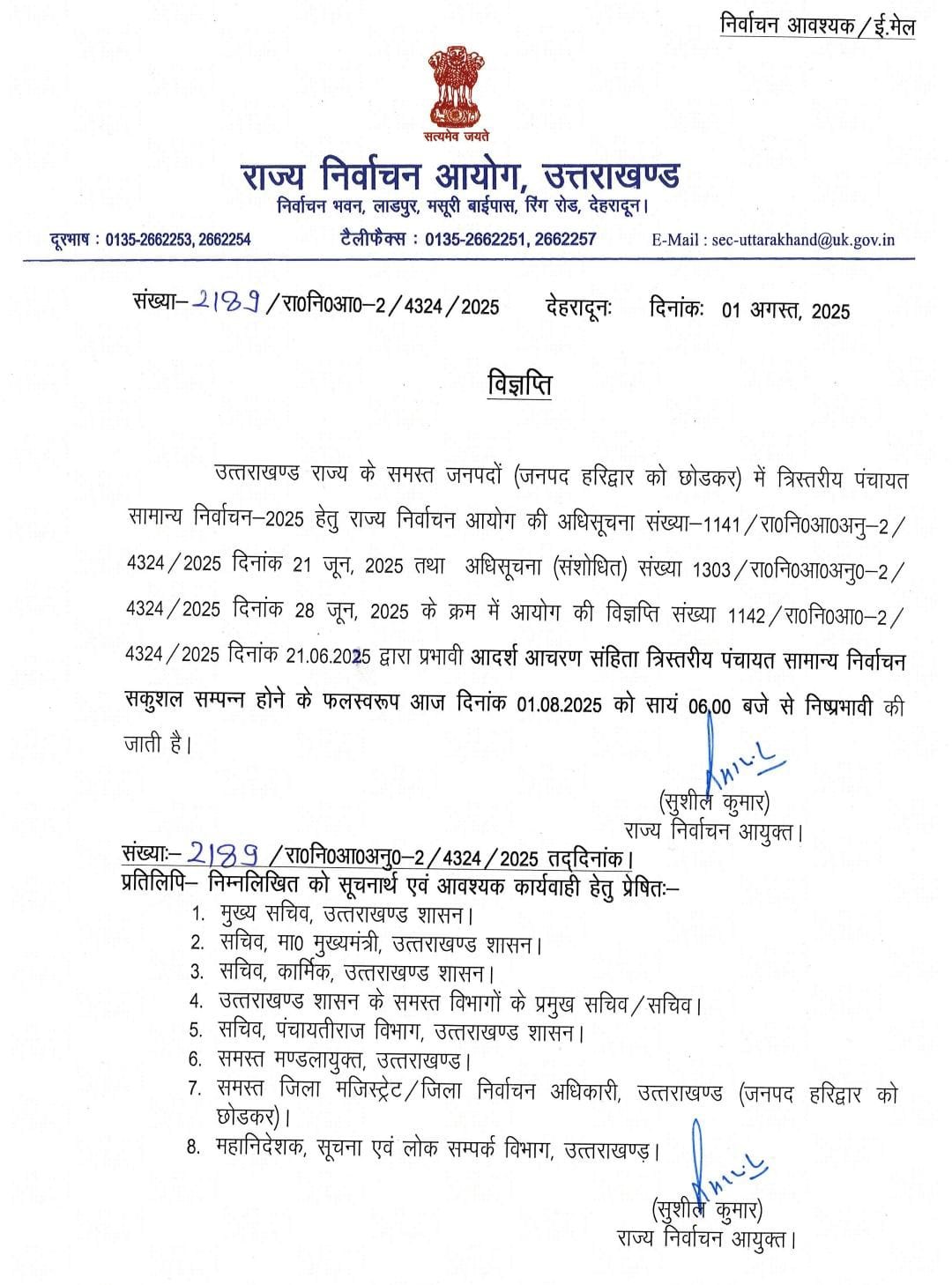 देहरादून। उत्तराखण्ड में त्रिस्तरीय पंचायत सामान्य निर्वाचन-2025 सम्पन्न होने के बाद आज, 1 अगस्त 2025 को शाम 6 बजे से आदर्श आचरण संहिता समाप्त कर दी गई है।