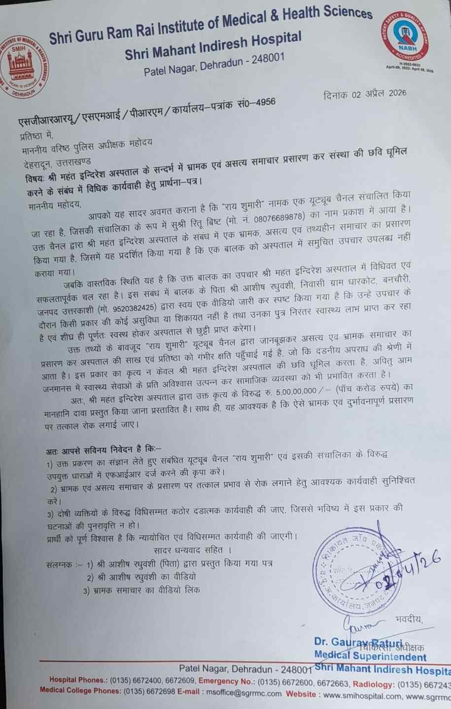• श्री महंत इन्दिरेश अस्पताल प्रबंधन ने SSP को तहरीर देकरयूट्यूब चैनल पर कड़ी कार्रवाई की मांग की