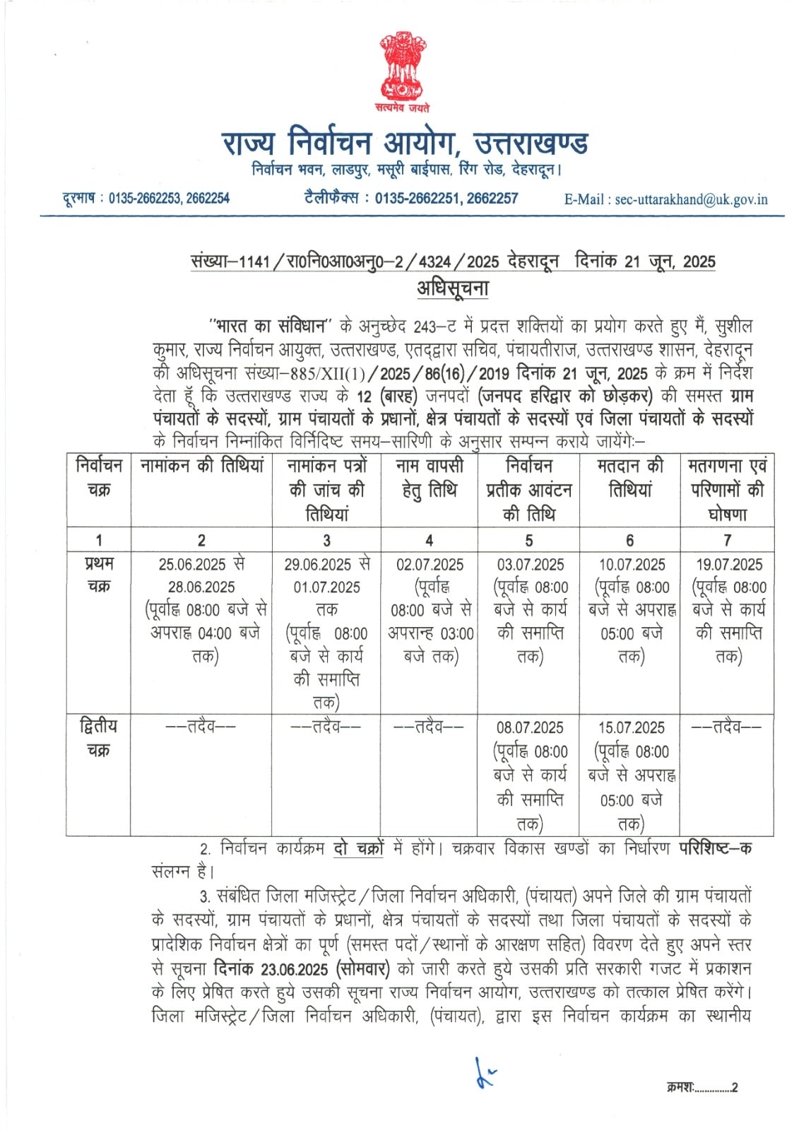 देहरादून। उत्तराखंड(हरिद्वार जनपद को छोड़कर) में त्रिस्तरीय पंचायत चुनाव की अधिसूचना जारी हो गई है। पूरे प्रदेश में दो चरणों, 10 जुलाई और 15 जुलाई को मतदान होगा। जबकि, 19 जुलाई को प्रदेशभर में एक साथ मतगणना होगी। पंचायत चुनाव की अधिसूचना जारी होने के साथ ही आज से (नगरीय क्षेत्रों एवं जनपद हरिद्वार को छोड़कर) आदर्श आचरण संहिता प्रभावी हो गई है, जो चुनाव परिणामों की घोषणा तक प्रभावी रहेगी।