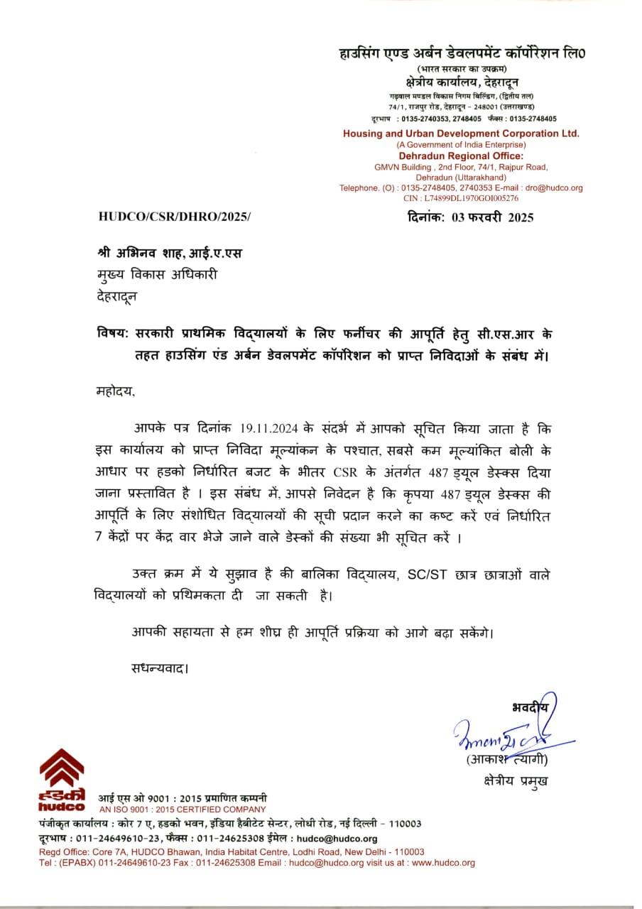 देहरादून। प्रोजेक्ट ‘‘उत्कर्ष’’ के तहत् सरकारी स्कूलों को पठन-पाठन आधुनिक तकनीक से को स्मार्ट बनाने के डीएम सविन बंसल के प्रयास धरातल पर उतरने लगे हैं। जिले के दुर्गम क्षेत्र के स्कूलों को अब फरवरी माह तक फर्नीचर मिल जाएगा। इस कार्य में ओएनजीसी व हुडको द्वारा सहयोग किया जा रहा है। जिलाधिकारी के इस महत्वाकांक्षी प्राजेक्ट में  हुडको द्वारा स्कूलों में पठनपाठन व्यवस्था हेतु आधुनिक उपकरण एलईडी के लिए 2.5 के कार्य प्रोसेस में हैं,जबकि ओएनजीसी  1.5 करोड़ के फर्नीचर एवं उपकरण में सहयोग कर रही है।