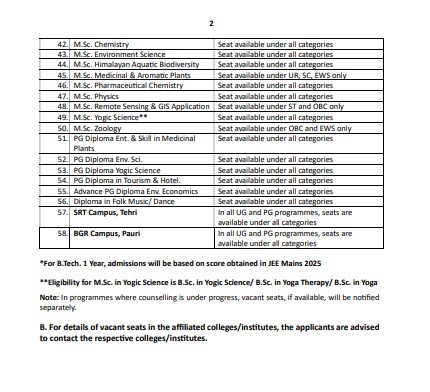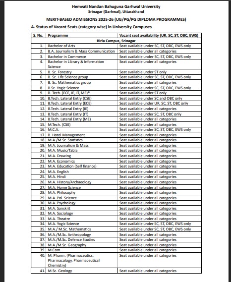 श्रीनगर गढ़वाल। हेमवती नंदन बहुगुणा गढ़वाल ͪविश्वविद्यालय के परिसरों और संबद्ध महाविद्यालयों/संस्थानों में शैक्षणिक सत्र 2025-26 के लिए स्नातक और स्नातकोत्तर कार्यक्रमों (बीए एलएलबी, एलएलबी, एलएलएम, बीएड, एमएड, बीपीएड तथा एमपीएड के अतिरिक्त) में अर्हक परीक्षा में प्राप्त अंकों के आधार पर रिक्त सीटों को भरने के लिए पंजीकरण प्रारंभ हो गया है।
