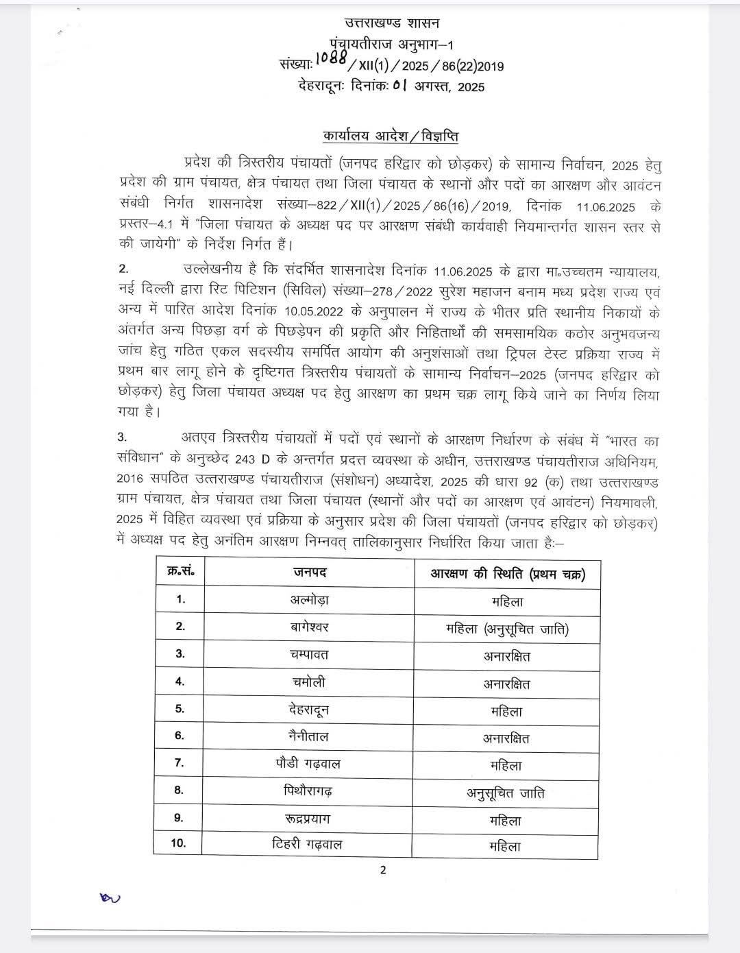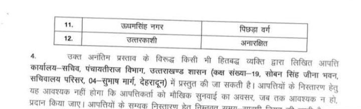 देहरादून। शासन ने जिला पंचायत अध्यक्ष पद के लिए अनंतिम आरक्षण जारी कर दिया है। अल्मोड़ा, बागेश्वर, देहरादून, पौड़ी गढ़वाल, रुद्रप्रयाग और टिहरी को महिलाओं के लिए आरक्षित किया गया। जबकि, चम्पावत, चमोली, नैनीताल और उत्तरकाशी को अनारक्षित रखा गया है। उधमसिंह नगर के पिछड़ा वर्ग और पिथौरागढ़ को अनुसूचित जाति के लिए आरक्षित रखा गया है।