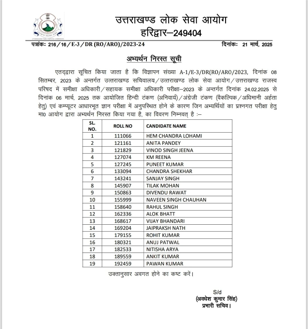 देहरादून। उत्तराखण्ड लोक सेवा आयोग द्वारा उत्तराखण्ड सचिवालय / उत्तराखण्ड लोक सेवा आयोग / उत्तराखण्ड राजस्व परिषद में समीक्षा अधिकारी / सहायक समीक्षा अधिकारी परीक्षा-2023 के अन्तर्गत दिनांक 24.02.2025 से 06 मार्च, 2025 तक आयोजित हिन्दी टंकण (अनिवार्य) / अंग्रेजी टंकण (वैकल्पिक / अधिमानी अर्हता हेतु) एवं कम्प्यूटर आधारभूत ज्ञान परीक्षा में अनुपस्थित होने के कारण 19 अभ्यर्थियों का आयोग द्वारा अभ्यर्थन निरस्त किया गया है।