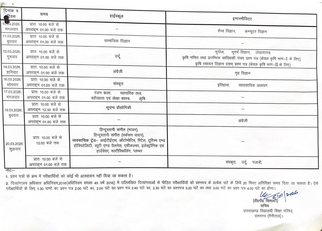रामनगर। उत्तराखण्ड विद्यालयी शिक्षा परिषद् रामनगर (नैनीताल) में आज सभापति डॉ० मुकुल कुमार सती की अध्यक्षता में वर्ष 2026 की हाईस्कूल एवं इण्टरमीडिएट परीक्षा कार्यक्रम के निर्धारण हेतु परीक्षा समिति की बैठक संपन्न हुई। परीक्षा समिति द्वारा सर्व सम्मति से निर्णय लिया गया कि उत्तराखण्ड बोर्ड द्वारा संचालित हाईस्कूल एवं इण्टरमीडिएट की सैद्धान्तिक परीक्षाएं 21 फरवरी, 2026 से आरम्भ होकर 20 मार्च, 2026 को सम्पन्न होंगी। हाईस्कूल एवं इण्टरमीडिएट 2026 की प्रयोगात्मक परीक्षाएं 16 जनवरी, 2026 से 15 फरवरी, 2026 के मध्य सम्पादित की जायेगी।