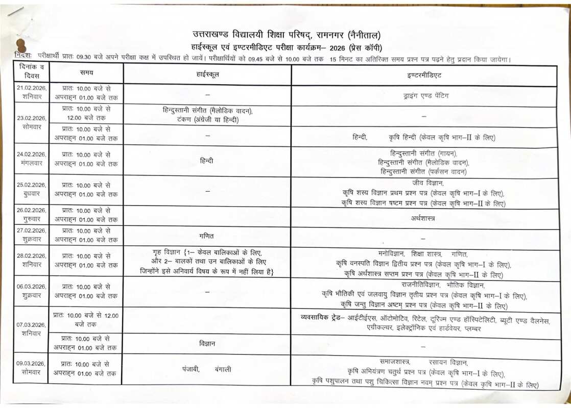 रामनगर। उत्तराखण्ड विद्यालयी शिक्षा परिषद् रामनगर (नैनीताल) में आज सभापति डॉ० मुकुल कुमार सती की अध्यक्षता में वर्ष 2026 की हाईस्कूल एवं इण्टरमीडिएट परीक्षा कार्यक्रम के निर्धारण हेतु परीक्षा समिति की बैठक संपन्न हुई। परीक्षा समिति द्वारा सर्व सम्मति से निर्णय लिया गया कि उत्तराखण्ड बोर्ड द्वारा संचालित हाईस्कूल एवं इण्टरमीडिएट की सैद्धान्तिक परीक्षाएं 21 फरवरी, 2026 से आरम्भ होकर 20 मार्च, 2026 को सम्पन्न होंगी। हाईस्कूल एवं इण्टरमीडिएट 2026 की प्रयोगात्मक परीक्षाएं 16 जनवरी, 2026 से 15 फरवरी, 2026 के मध्य सम्पादित की जायेगी।