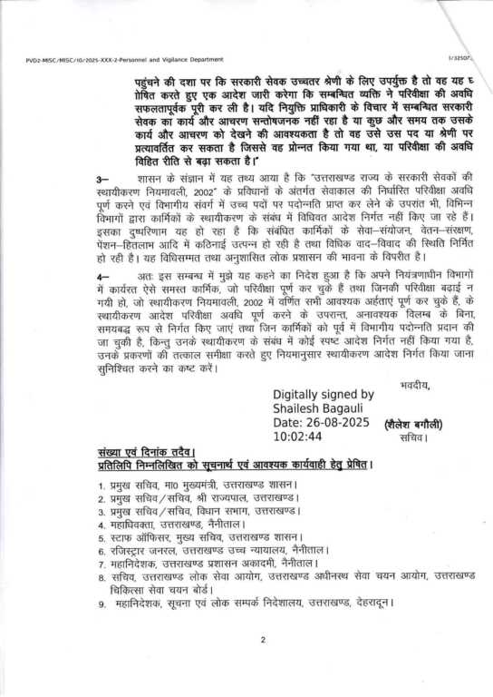 सचिव कार्मिक शैलेश बगौली ने शासनादेश जारी करते हुए सभी प्रमुख सचिवों, विभागाध्यक्षों, मंडलायुक्तों एवं जिलाधिकारियों को निर्देशित किया है कि अपने-अपने विभागों में कार्यरत ऐसे कार्मिक जो परिवीक्षा पूर्ण कर चुके हैं और स्थायीकरण नियमावली 2002 की सभी अर्हताओं को पूरा करते हैं, उनके स्थायीकरण आदेश समयबद्ध रूप से निर्गत किए जाएं।