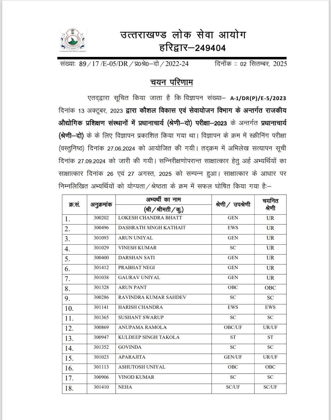 देहरादून उत्तराखंड लोक सेवा आयोग ने कौशल विकास एवं सेवायोजन विभाग के अन्तर्गत राजकीय औद्योगिक प्रशिक्षण संस्थानों में प्रधानाचार्य (श्रेणी-दो) परीक्षा-2023 का अंतिम परीक्षा परिणाम घोषित कर दिया है।