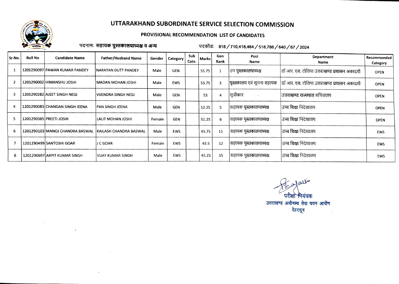 देहरादून। उत्तराखंड अधीनस्थ सेवा चयन आयोग ने उप पुस्तकालयाध्यक्ष/पुस्तकालय एवं सूचना सहायक/ सहायक पुस्तकालयाध्यक्ष/सूचीकार भर्ती परीक्षा का रिजल्ट घोषित कर दिया है।