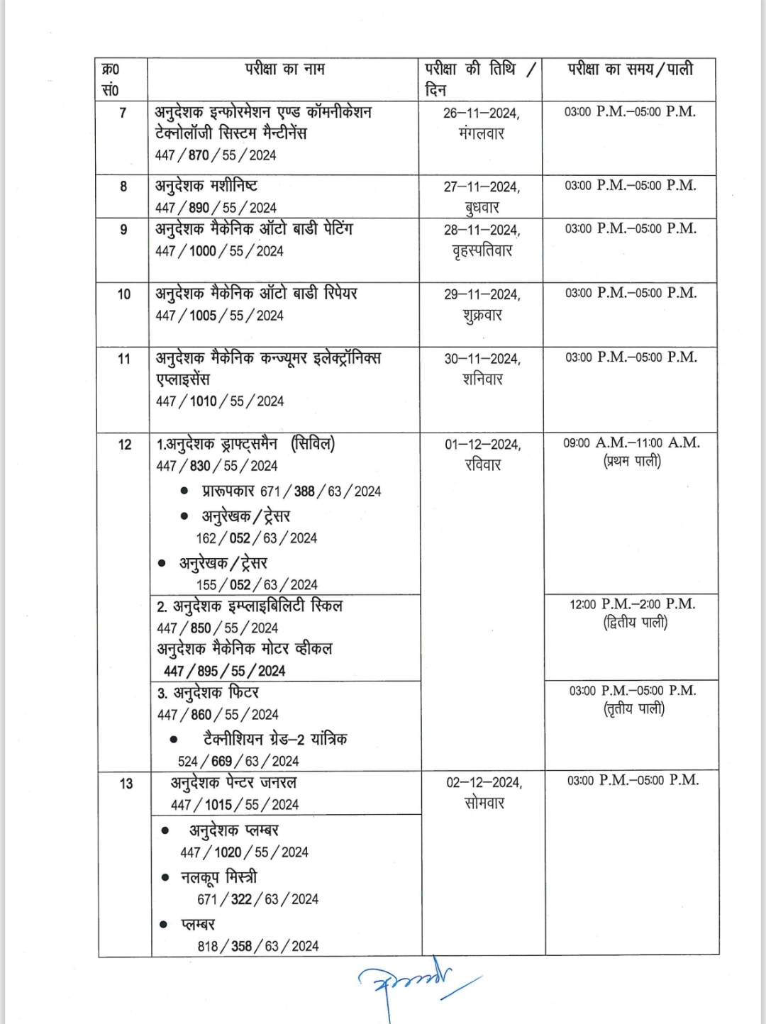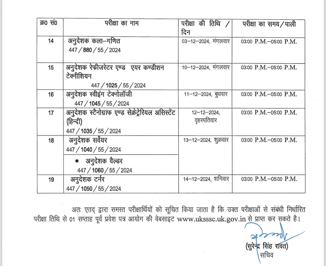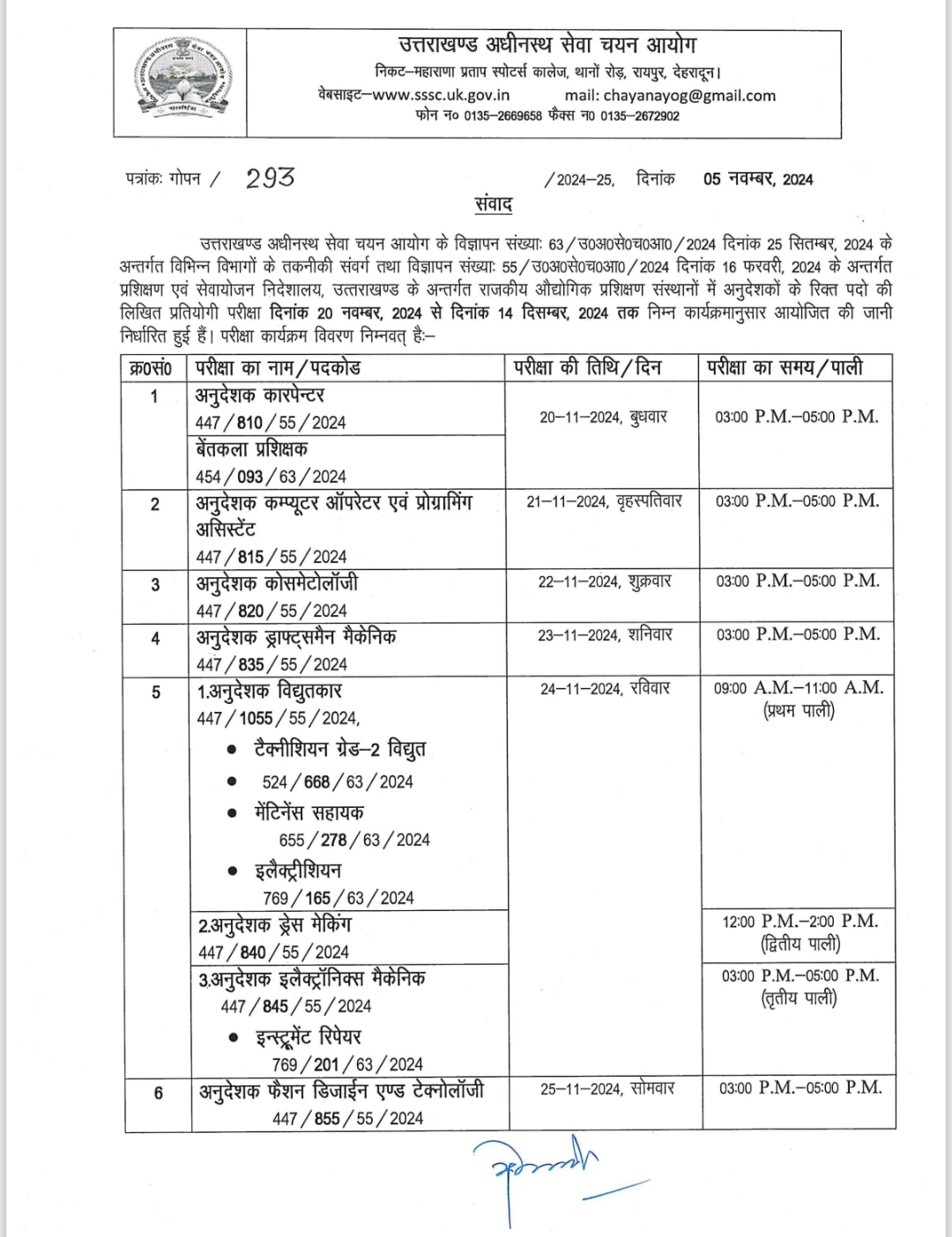 देहरादून। उत्तराखण्ड अधीनस्थ सेवा चयन आयोग के विज्ञापन संख्याः 63/उ०अ० से०च०आ०/2024 दिनांक 25 सितम्बर, 2024 के अन्तर्गत विभिन्न विभागों के तकनीकी संवर्ग तथा विज्ञापन संख्याः 55/उ०अ०से०च०आ०/2024 दिनांक 16 फरवरी, 2024 के अन्तर्गत प्रशिक्षण एवं सेवायोजन निदेशालय, उत्तराखण्ड के अन्तर्गत राजकीय औद्योगिक प्रशिक्षण संस्थानों में अनुदेशकों के रिक्त पदो की लिखित प्रतियोगी परीक्षा दिनांक 20 नवम्बर, 2024 से दिनांक 14 दिसम्बर, 2024 तक निम्न कार्यक्रमानुसार आयोजित की जानी निर्धारित हुई है। परीक्षा कार्यक्रम विवरण निम्नवत् है:-