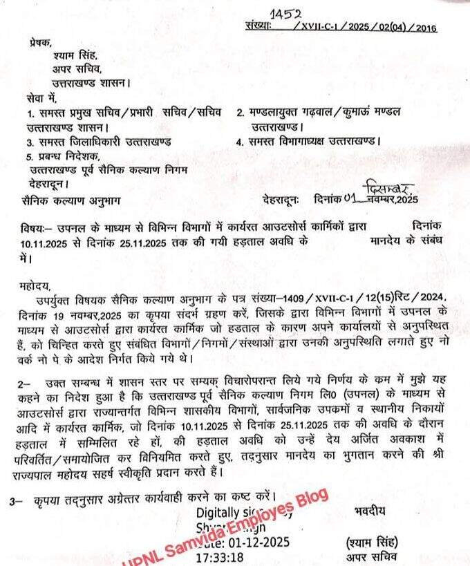 आदेश में कह गया है कि उपनल के माध्यम से आउटसोर्स द्वारा विभिन्न सरकारी विभागों, सार्वजनिक उपक्रमों व स्थानीय निकायोें आदि में कार्यरत कार्मिक, जो 10 नवंबर से 25 नवंबर 2025 तक हड़ताल में रहे हों, की हड़ताल अवधि का उन्हें देय अर्तित अवकाश में परिवर्तित/समायोजित कर विनियमित करते हुए उन्हें मानदेय का भुगतान किया जाए।