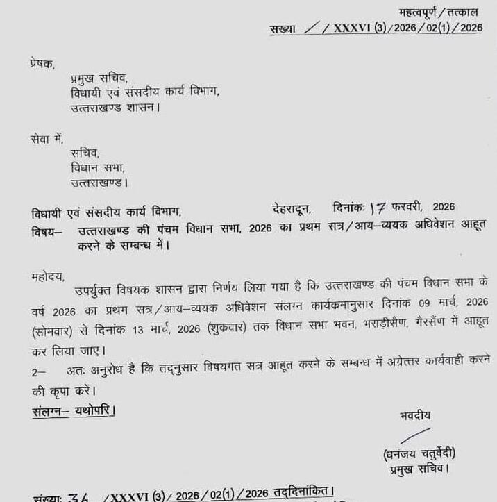 देहरादून। उत्तराखंड विधानसभा का बजट सत्र 09 मार्च से 13 मार्च तक विधान सभा भवन, गैरसैंण में होगा। मंगलवार को प्रमुख सचिव, विधायी एवं संसदीय कार्य विभाग धनंजय चतुर्वेदी ने बजट सत्र की अधिसूचना जारी कर दी है।