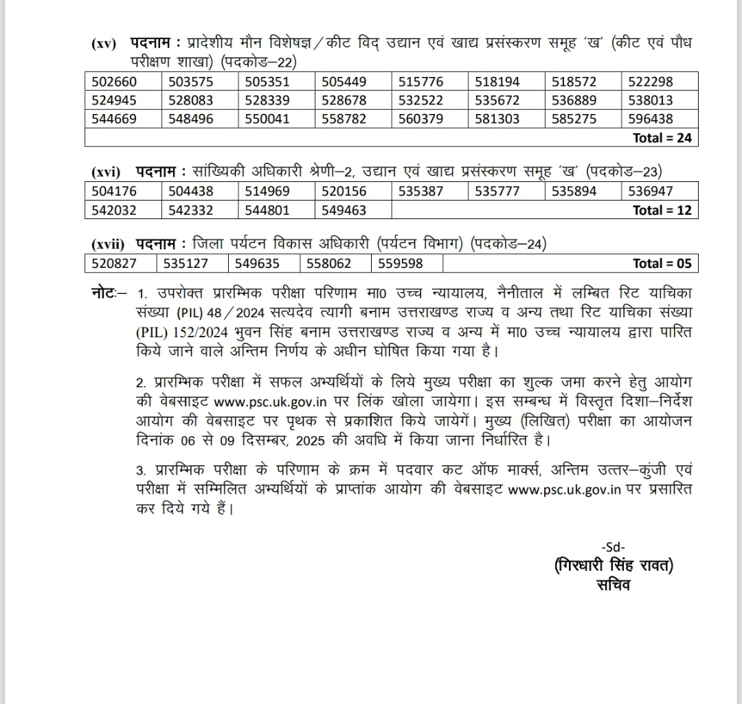 देहरादून। उत्तराखंड लोक सेवा आयोग ने उत्तराखण्ड सम्मिलित राज्य सिविलध्प्रवर अधीनस्थ सेवा परीक्षा-2025 की प्रारंभिक परीक्षा का रिजल्ट घोषित कर दिया है। प्रारम्भिक परीक्षा 29 जून, 2025 को आयोजित की गयी तथा 15 अभ्यर्थियों के लिए द्वितीय प्रश्नपत्र सामान्य बुद्धिमत्ता के लिए पुनः परीक्षा 10 सितम्बर 2025 को आयोजित की गई।
