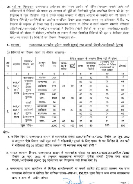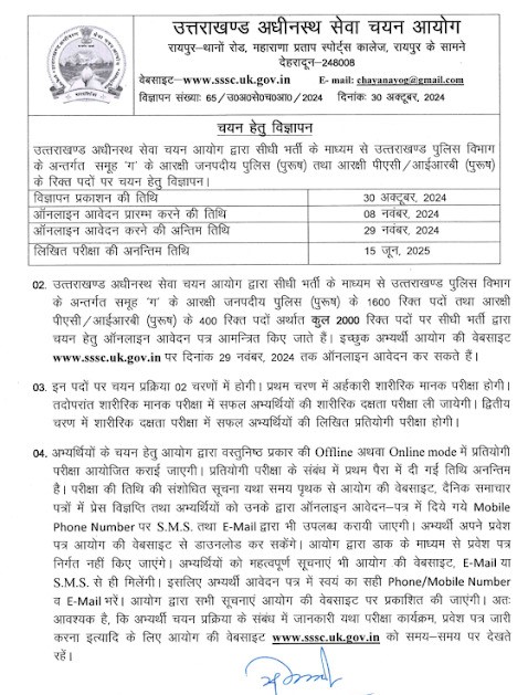 देहरादून। उत्तराखण्ड अधीनस्थ सेवा चयन आयोग(UKSSSC) द्वारा सीधी भर्ती के माध्यम से उत्तराखण्ड पुलिस विभाग के अन्तर्गत समूह ‘ग’ के आरक्षी जनपदीय पुलिस (पुरुष) के 1600 रिक्त पदों तथा आरक्षी पीएसी/आईआरबी (पुरुष) के 400 रिक्त पदों अर्थात कुल 2000 रिक्त पदों पर सीधी भर्ती द्वारा चयन हेतु ऑनलाइन आवेदन पत्र आमन्त्रित किए जाते हैं। इच्छुक अभ्यर्थी आयोग की वेबसाइट www.sssc.uk.gov.in पर दिनांक 29 नवंबर, 2024 तक ऑनलाइन आवेदन कर सकते हैं।