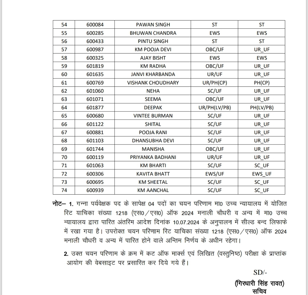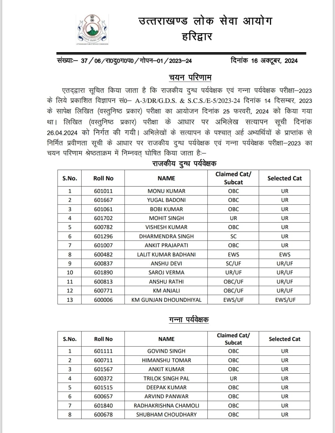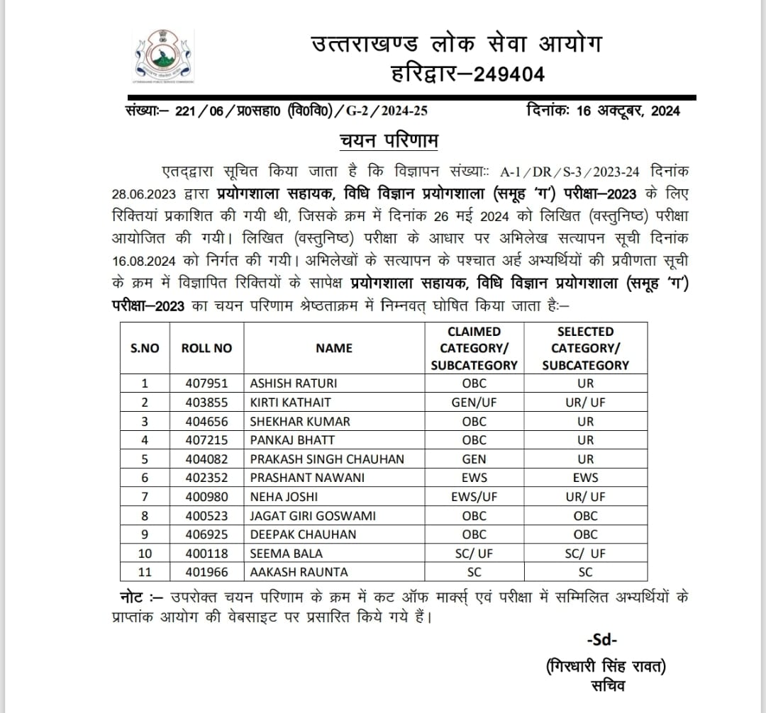 देहरादून। उत्तराखण्ड लोक सेवा आयोग ने राजकीय दुग्ध पर्यवेक्षक एवं गन्ना पर्यवेक्षक परीक्षा-2023 और प्रयोगशाला सहायक, विधि विज्ञान प्रयोगशाला (समूह-ग) परीक्षा-2023 का परीक्षाफल घोषित कर दिया है।